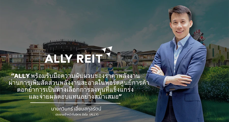 ALLY REIT นักลงทุนและผู้ดำเนินงานด้านอสังหาริมทรัพย์ประเภทคอมมูนิตี้มอลล์และโครงการมิกซ์ยูสในกรุงเทพมหานครและทั่วประเทศไทย ด้วยแนวทางการลงทุนอย่างรอบคอบและการบริหารจัดการอย่างมีความรับผิดชอบ เรามุ่งมั่นยกระดับคุณภาพของสถานที่อยู่อาศัย ที่ทำงาน และพื้นที่สำหรับการเชื่อมโยงของผู้คน เพื่อสร้างคุณค่าในระยะยาวแก่ผู้ลงทุน และส่งเสริมผลกระทบเชิงบวกต่อสังคมและสิ่งแวดล้อมโดยรอบ